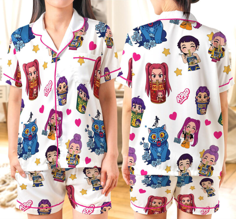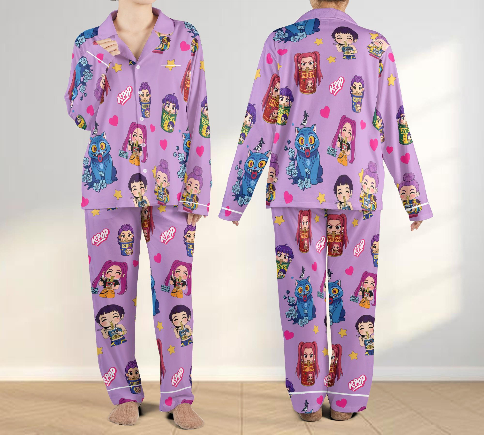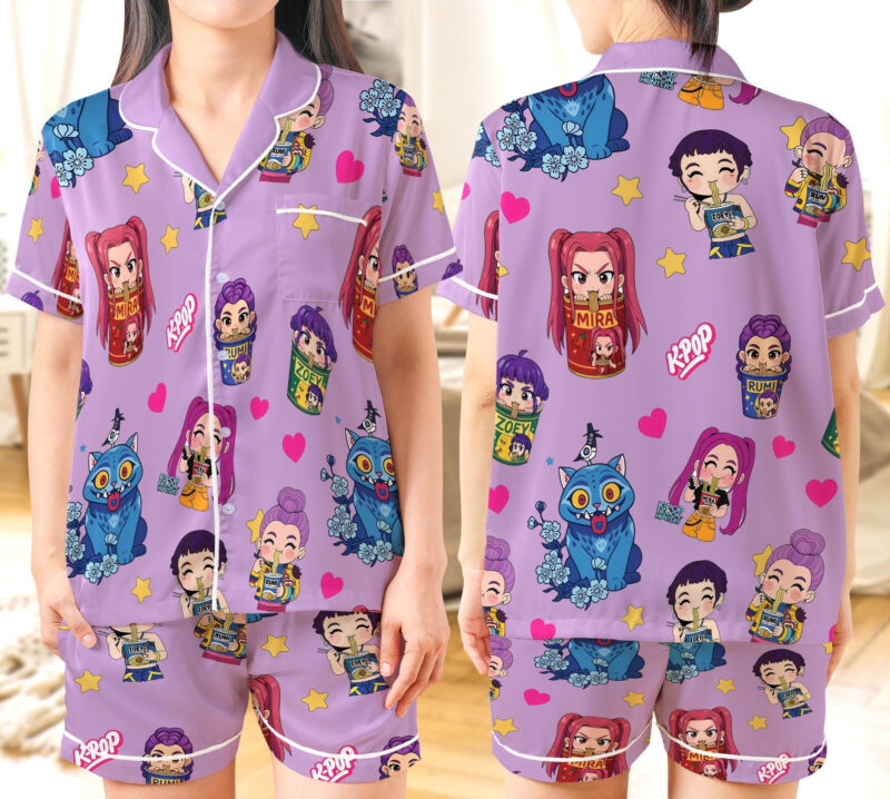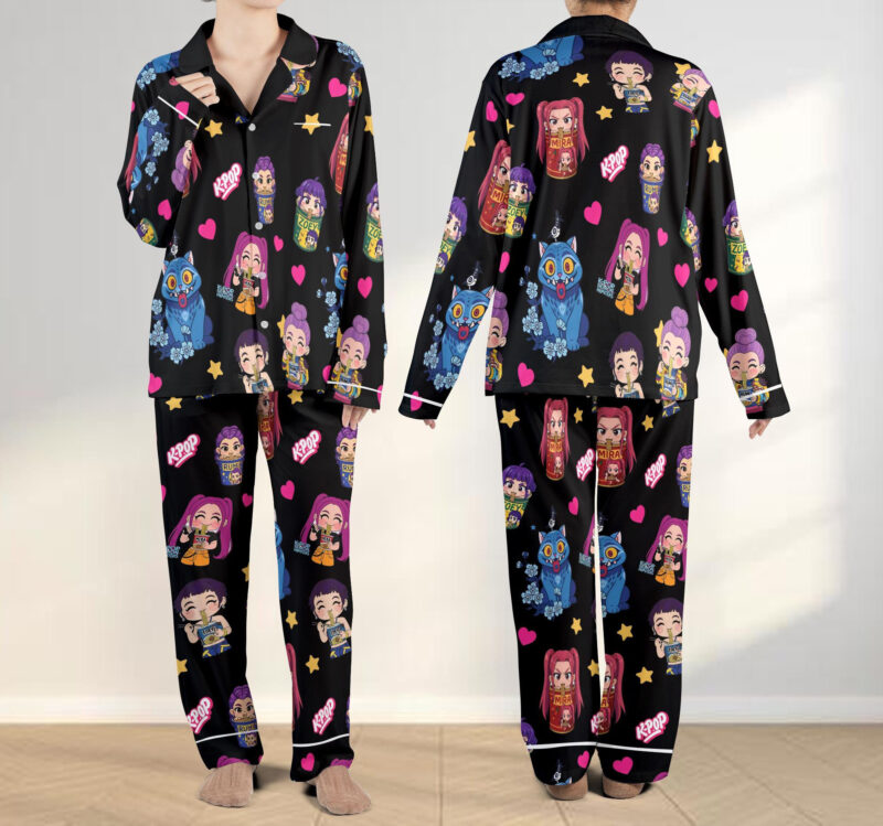 Stay cozy in style with this vibrant pajama set featuring playful K-Pop Demon Hunter -inspired prints. Made from soft, breathable fabric, it’s perfect for lounging, relaxing, or adding a fun touch to your sleepwear collection.