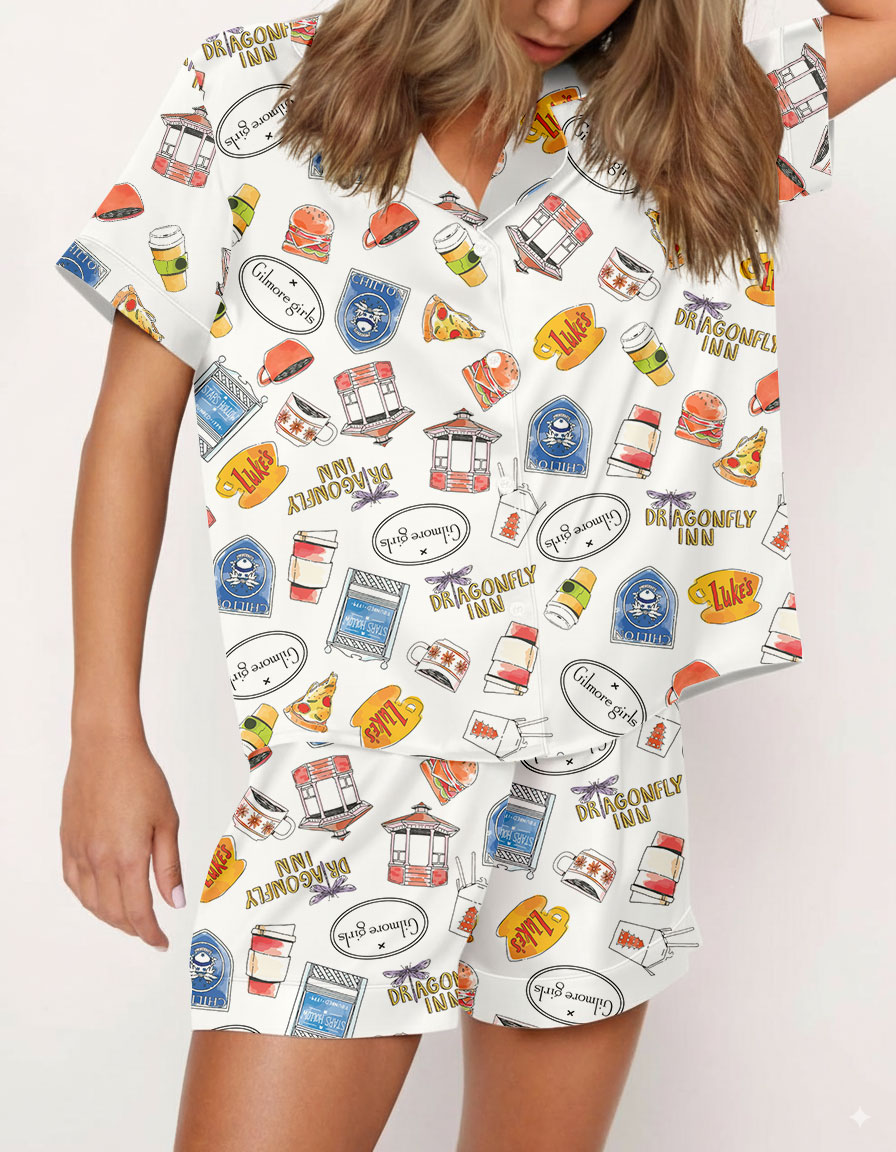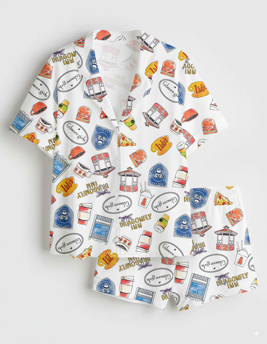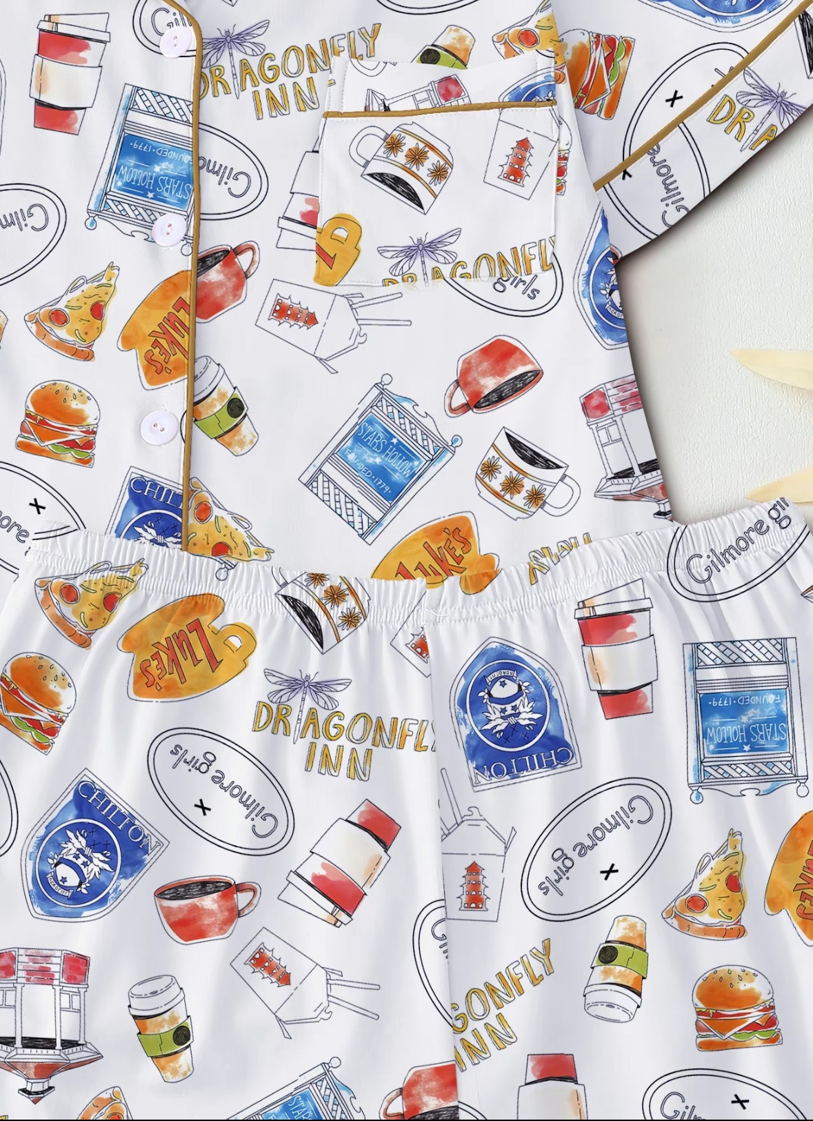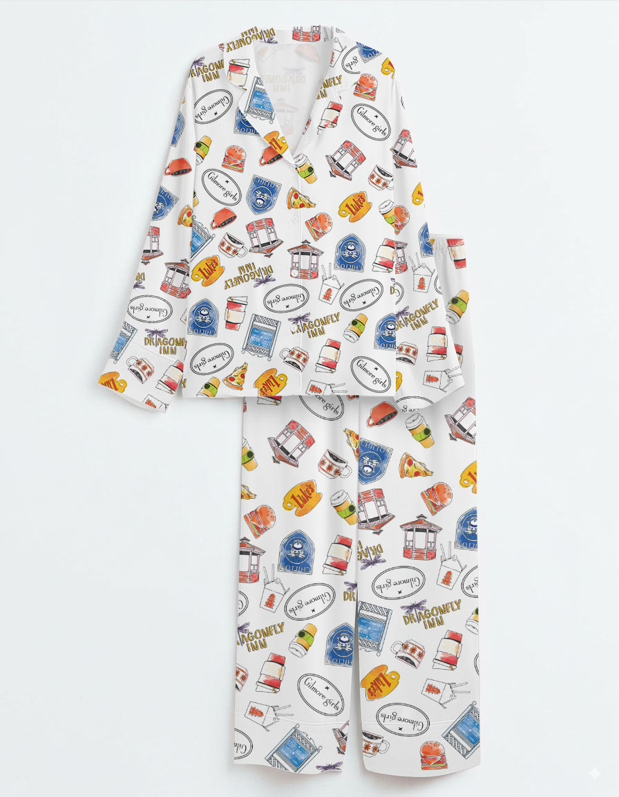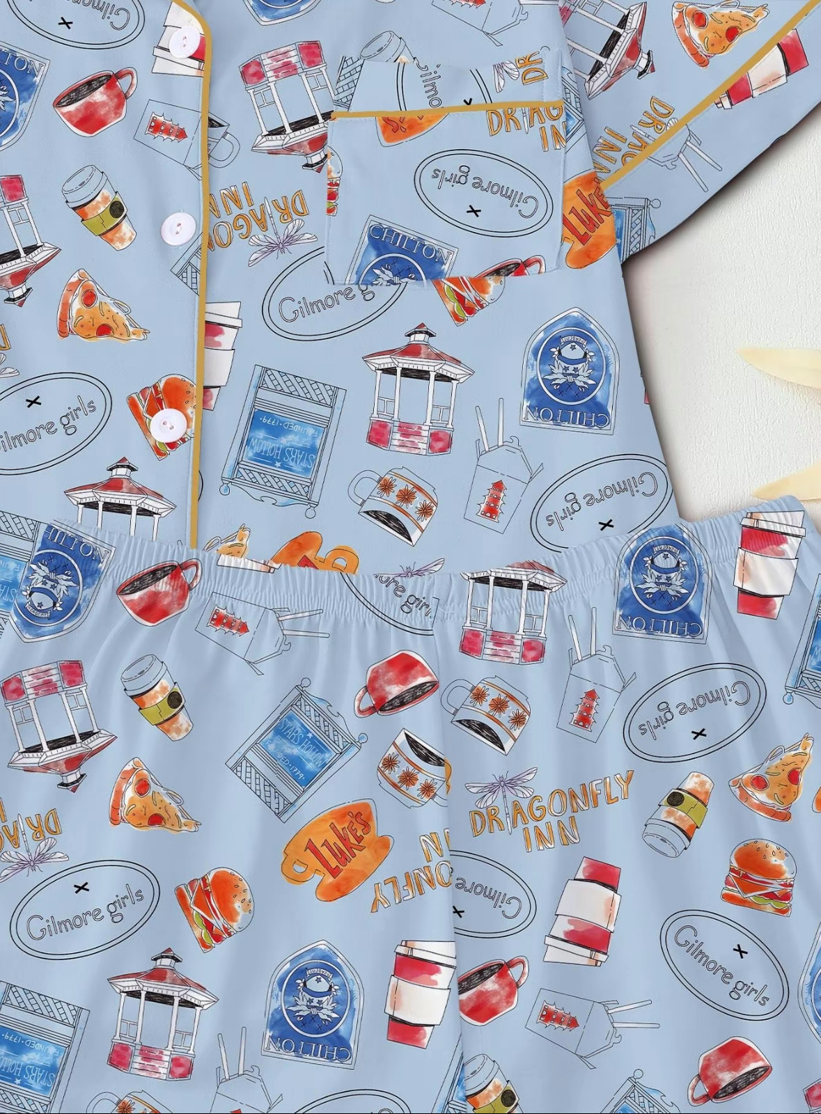 💫 Cozy up Stars Hollow–style with this Gilmore Girls pajama set featuring Luke’s Diner, Dragonfly Inn, and other iconic details from the beloved series. Made from 92% Polyester and 8% Spandex, these PJs are soft, stretchy, and perfect for lounging, sleeping, or binge-watching your favorite episodes. ☕✨