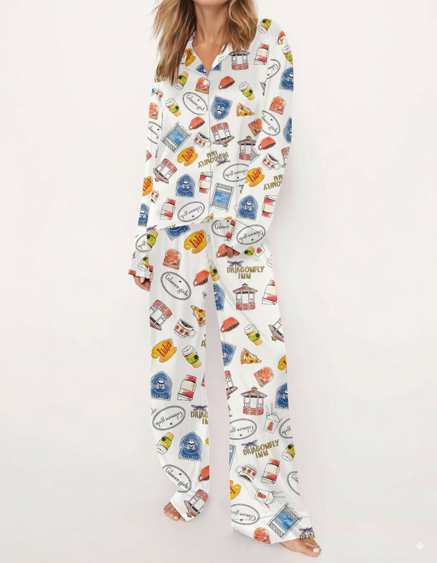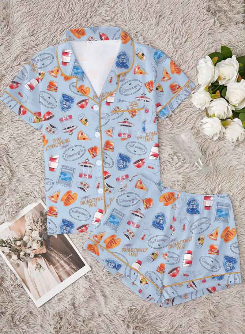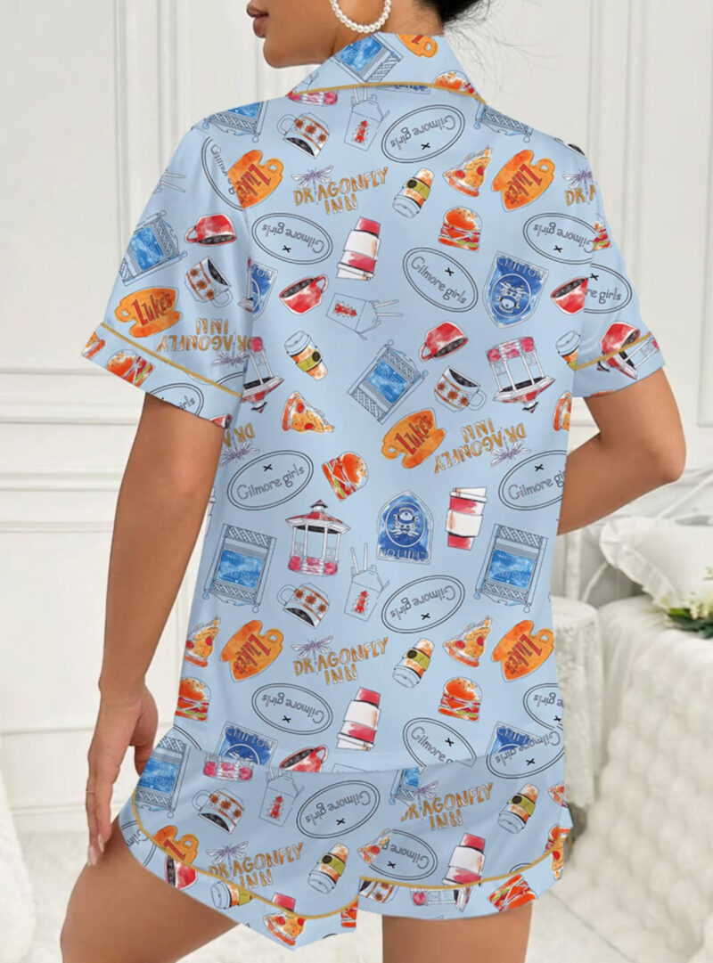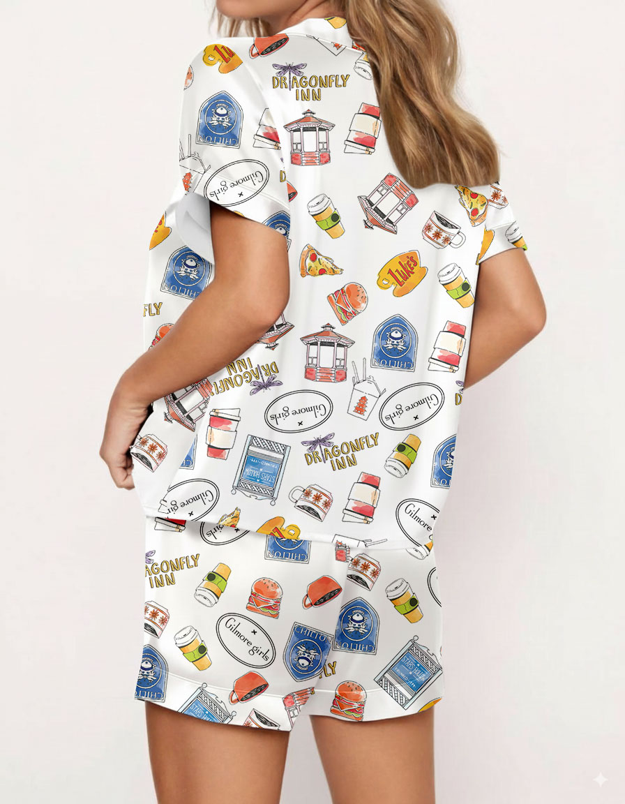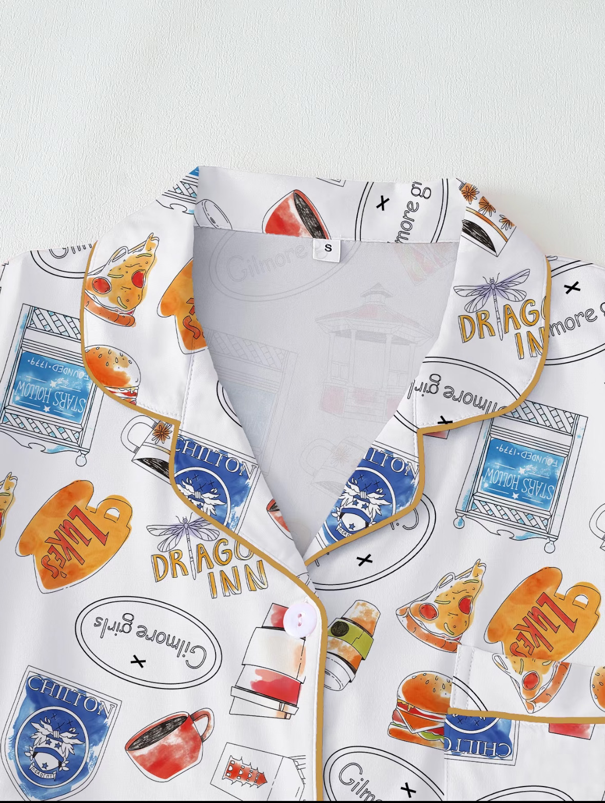 💫 Cozy up Stars Hollow–style with this Gilmore Girls pajama set featuring Luke’s Diner, Dragonfly Inn, and other iconic details from the beloved series. Made from 92% Polyester and 8% Spandex, these PJs are soft, stretchy, and perfect for lounging, sleeping, or binge-watching your favorite episodes. ☕✨